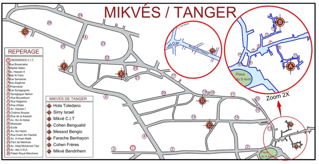 Ce projet de recherche, mené avec rigueur et passion par Mme Sonia Cohen Azagury et M. Omar Akassri, vise à faire revivre la mémoire de ces lieux emblématiques de la Communauté Israélite de Tanger (CIT). Aujourd’hui, seul le mikvé Bendrihem subsiste, mais Mme Sonia Cohen conserve le souvenir de huit autres établissements dont elle a pu localiser les emplacements. Ceux-ci sont désormais signalés sur le plan cartographique réalisé avec précision et clarté par M. Fouad Ammor, apportant une dimension visuelle précieuse à cette initiative patrimoniale.