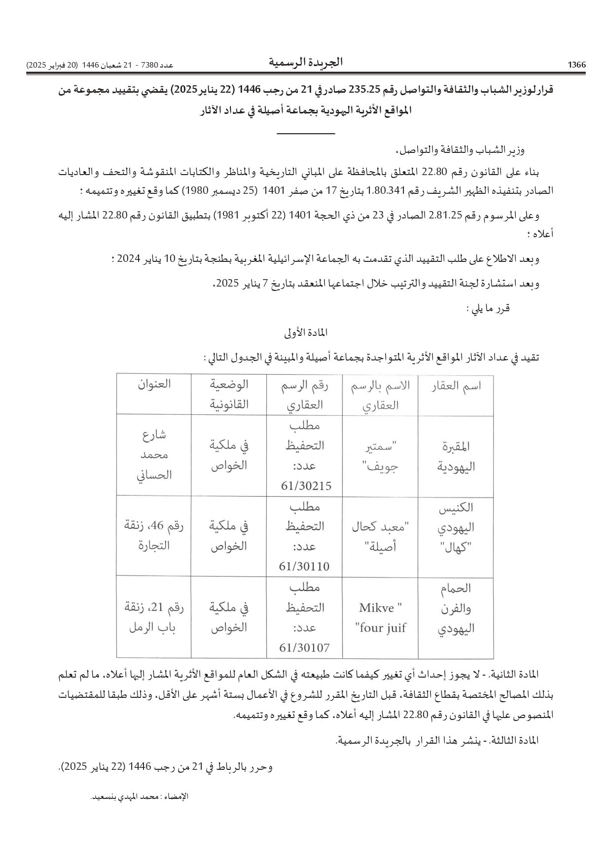 Marruecos continúa preservando su patrimonio multicultural al añadir tres sitios históricos judíos en la ciudad de Arcila a su lista oficial de patrimonio nacional. Esta decisión, anunciada por el Ministerio de Cultura el 20 de febrero 2025 supone un nuevo reconocimiento a la historia y la contribución de la comunidad judía